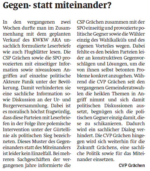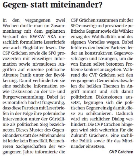 Stellungnahme der CVP Grächen im WB vom 7. Juli 2011 11. Juli 20119. Juli 2011 von csp.admin Die CSP Grächen stellt die Plattform der CSPG gerne für den Leserbrief der CVP Grächen zur Verfügung. Schliesslich muss ein so netter Artikel für immer festgehalten werden. Kommentare sind gerne erwünscht. Bitte zum Lesen anklicken